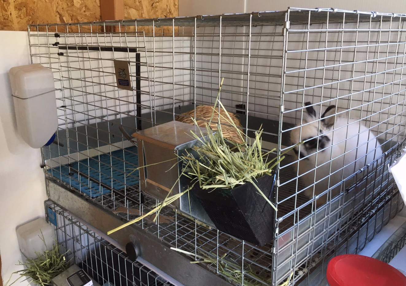 My bunnies live in metal 24x30 cages. Some people use 24x24 cages, but I thought they were a bit too small, especially if you need to fit a huddle box when it gets cold. You can also use a hutch.